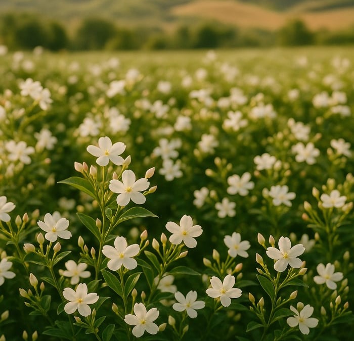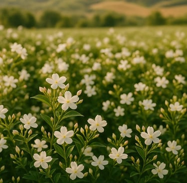 Au cœur, la Rose de Mai rayonne dans une étreinte florale, rejointe par un jasmin lumineux et un genêt miellé.