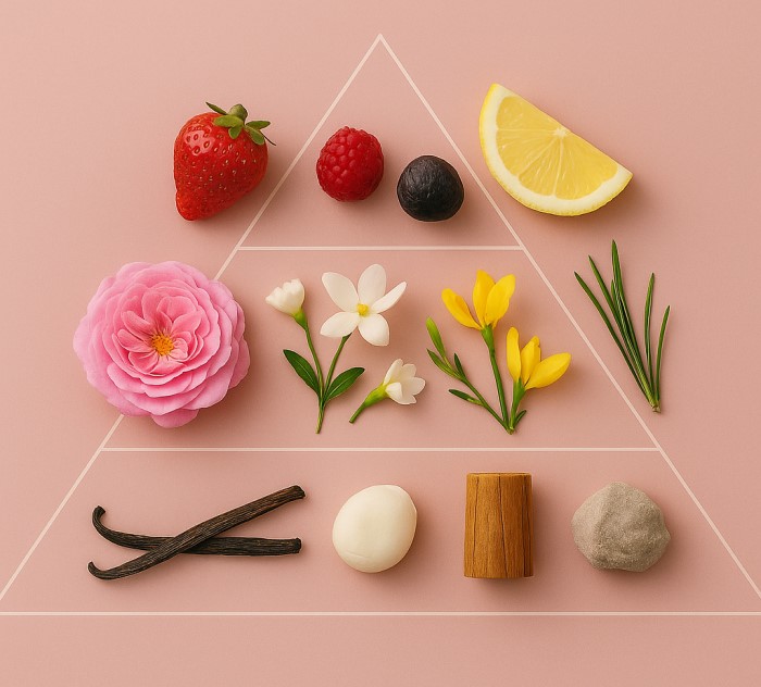 Le fond, musqué et doux, s’ancre dans la peau... vanille, santal et ambre gris tissent une sensualité discrète et persistante.