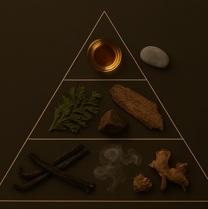 Le fond est une mémoire profondément ancrée... vanille, racine d’iris, patchouli et une braise de feu lente. Une douceur grave, une lumière basse, une trace vivante reliée à la Terre Mère.